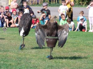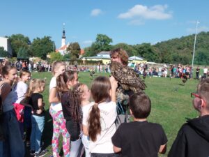 Letová ukázka dravců z Lednice proběhla 26. 9. 2023 na ploše Stadionu TJ Oslavany. Žáci si prohlédli dravce a sovy, viděli letové ukázky a také podpořili stanici pro hendikepované dravce a sovy.