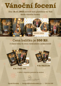 Ve čtvrtek dne 16. 11. 2023 proběhne v naší škole focení s vánoční tématikou. Podívejte se na naši nabídku. Pokud budete mít o fotografie zájem, potvrďte prosím třídním učitelům.
