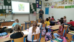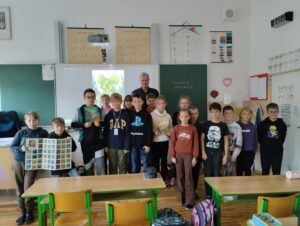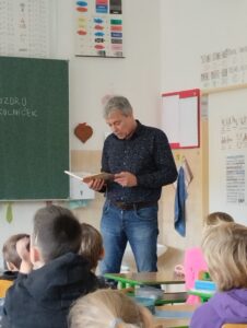 V listopadu navštívil všechny třídy 1. stupně spisovatel Josef Beneš. Přišel představit svoji knihu Meďan a Koumen. Nejdříve dětem pustil komentované video, jak se tato kniha tvořila, vyráběla a tiskla. Záběry, jak to v tiskárně probíhá, byly velmi zajímavé. Nakonec z knihy přečetl krátkou ukázku a o jednotlivých hrdinech si s dětmi povídal.